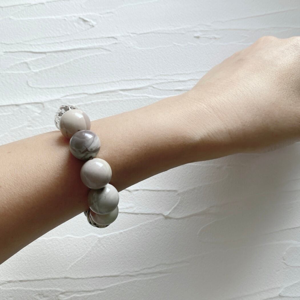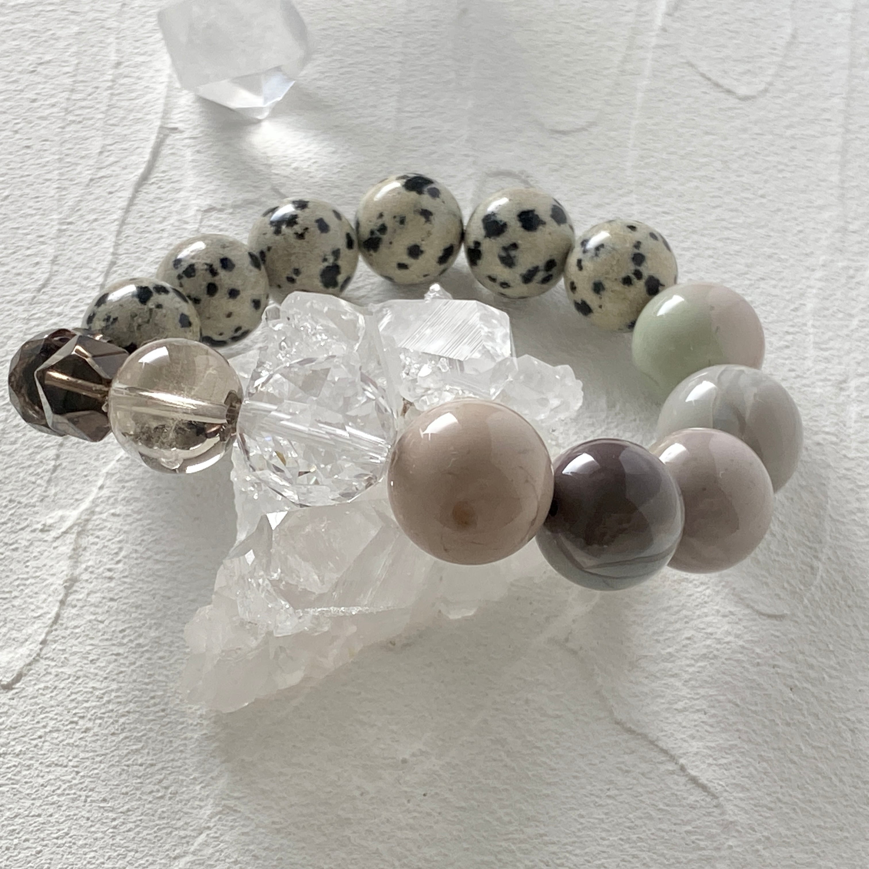 軽やかな遊び心としっかりと地に足のついた自分軸をやさしくひとつに調和してくれる、ほっとこころが和むような、大人カラーの大玉ブレスレットです。