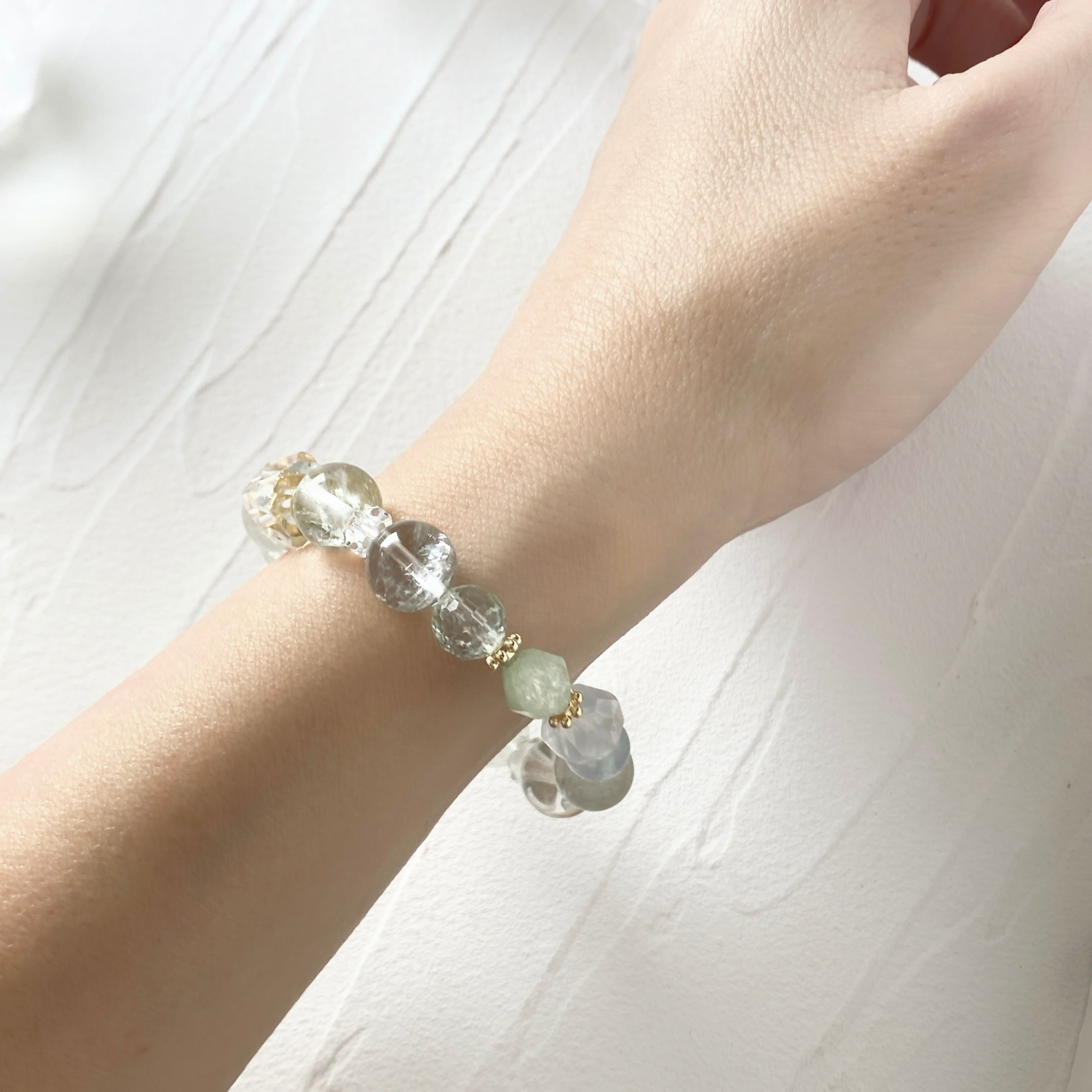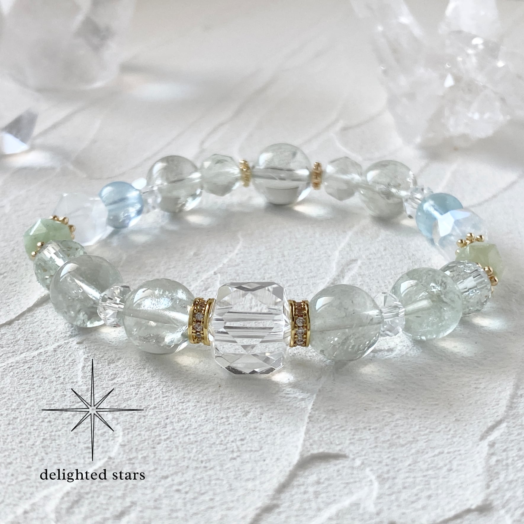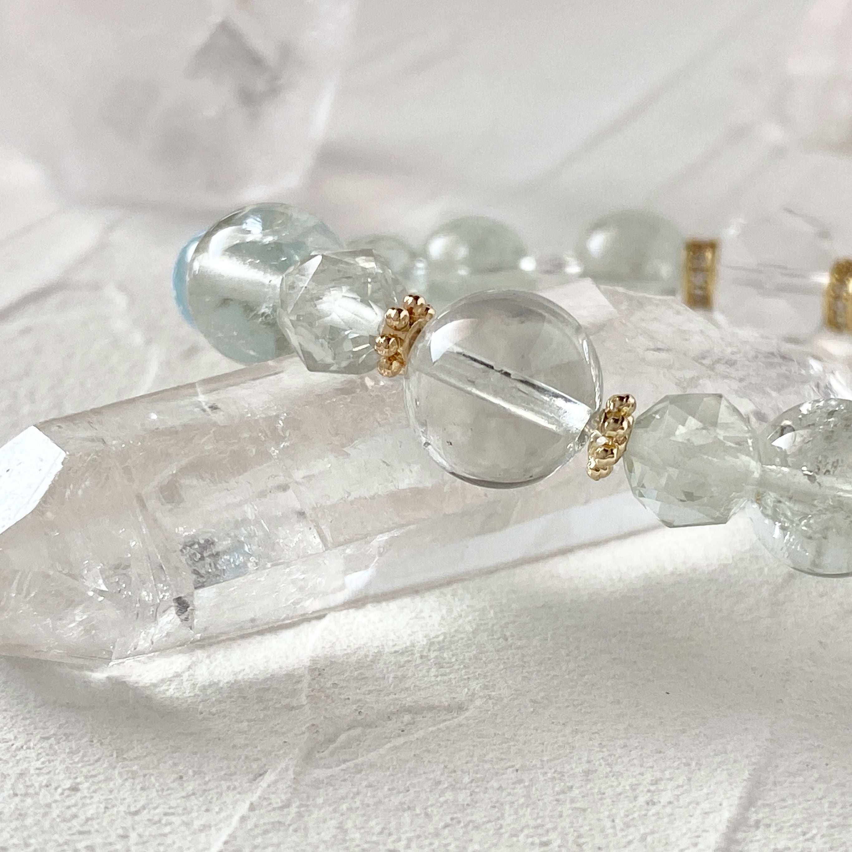 【透明な癒し】グリーンアメジスト ペリステライト アクアマリン ヒデナイト 水晶 天然石ブレスレット デザインブレスレット パワーストーンブレスレット