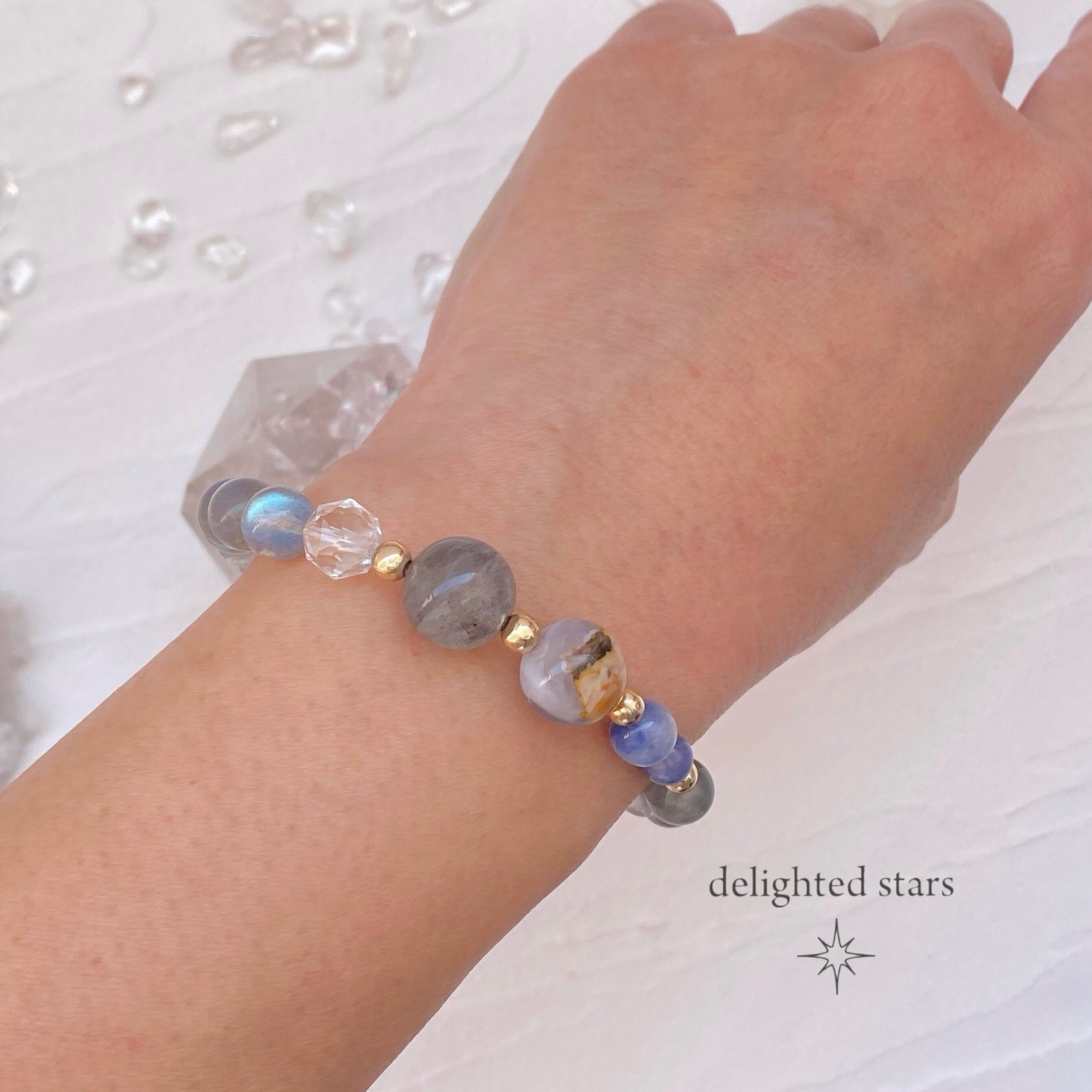 ブルー系の石の中でも希少であり、かつ群を抜いて美しく人気のある、母岩付きブルーカルセドニー、デュモルチェライト、タンザナイトと組み合わせ、ラブラドライトの品質の高さを引き立てるよう、最高のデザインブレスレットを目指してお作りしました。