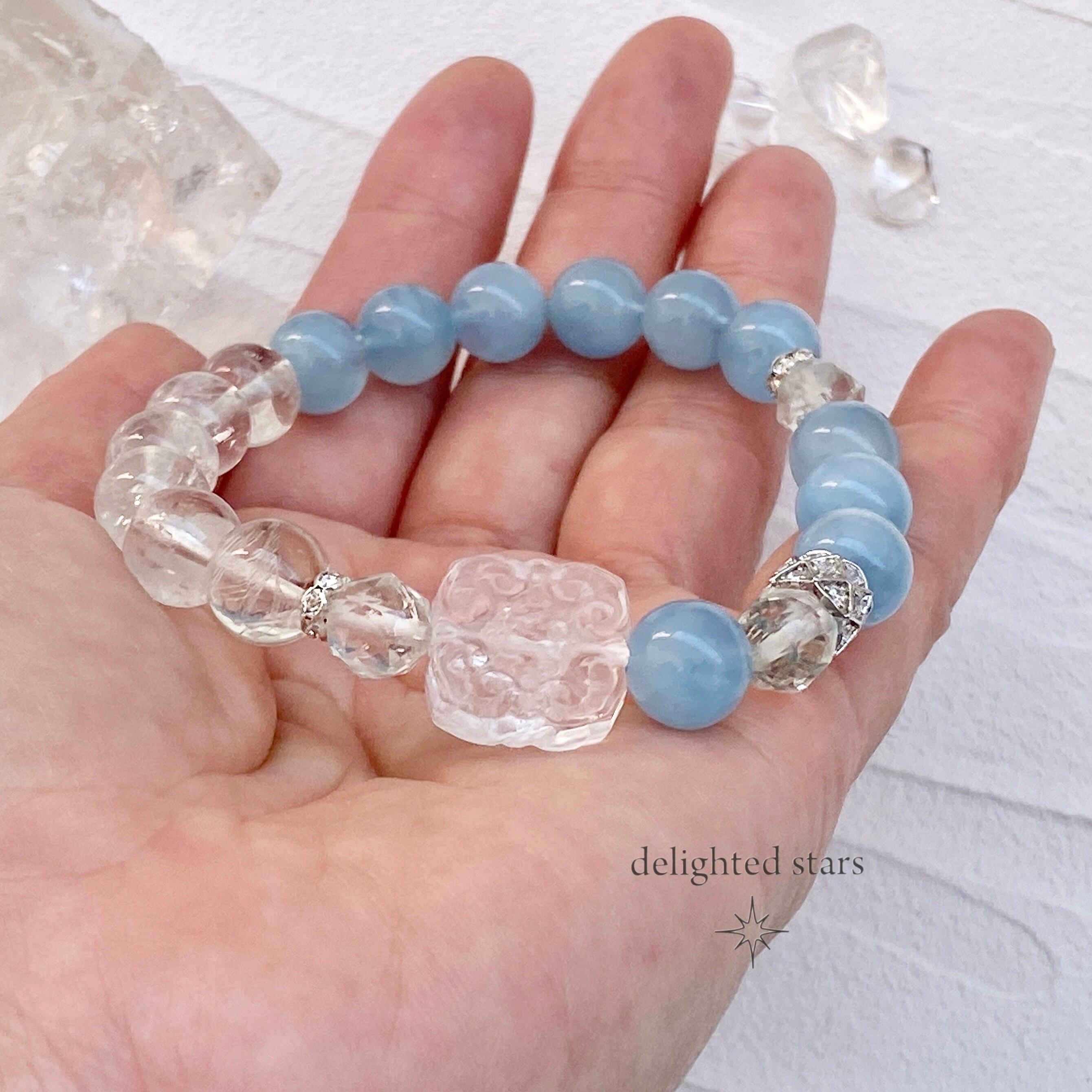 〈再販〉アクアマリン アイリスグリーンアメジスト 水晶 如意彫り物 天然石 ブレスレット パワーストーンブレスレット デザインブレスレット