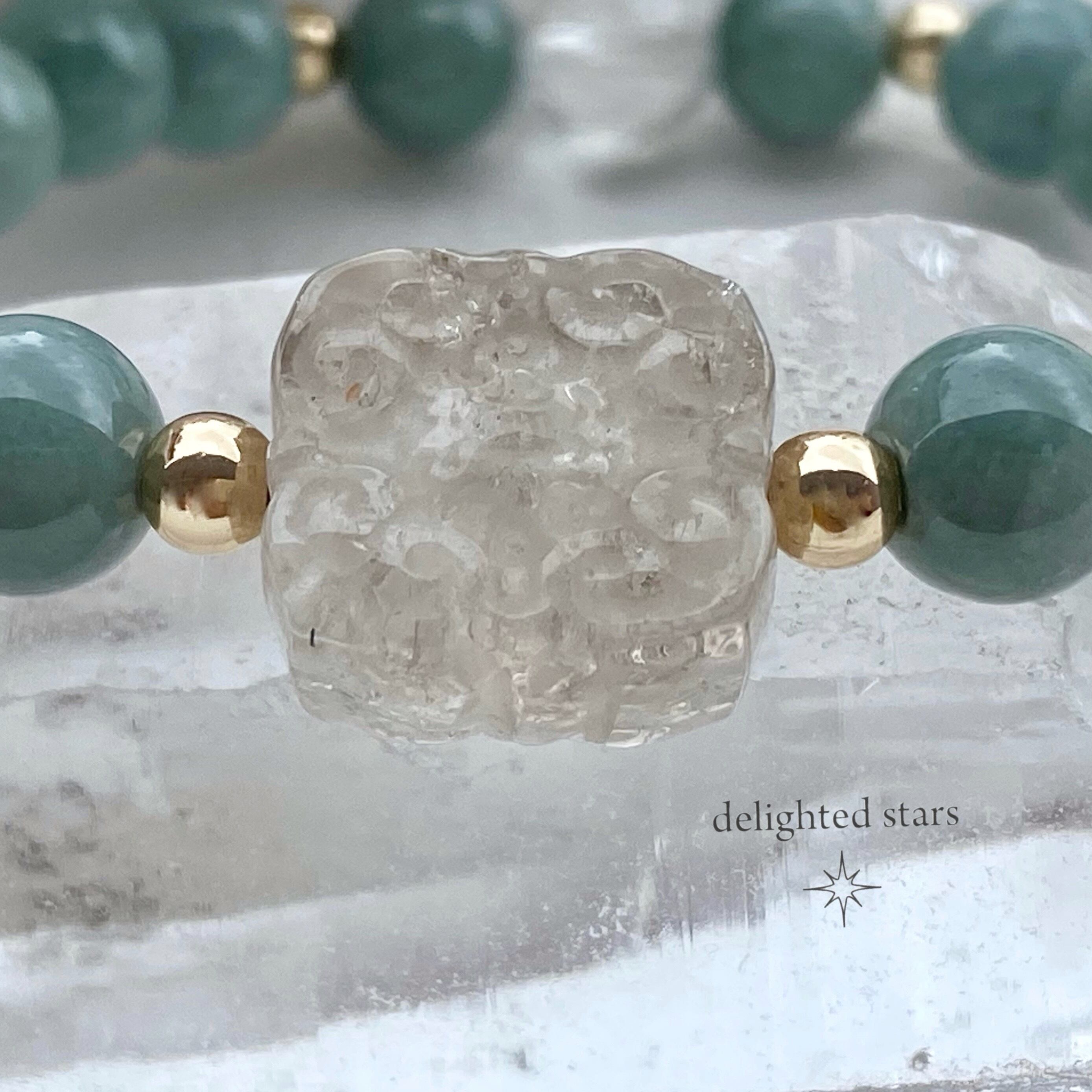 グリーンの発色が美しいミャンマー産の翡翠と14kgfのラウンドビーズをベースに、トップには如意の彫りが施されたライトカラーのスモーキークォーツを。