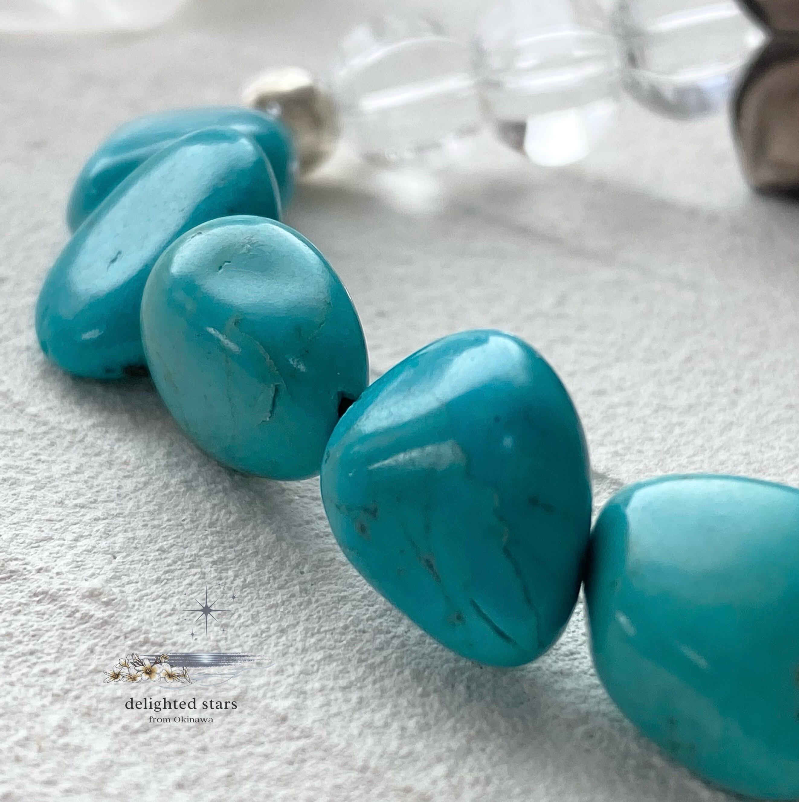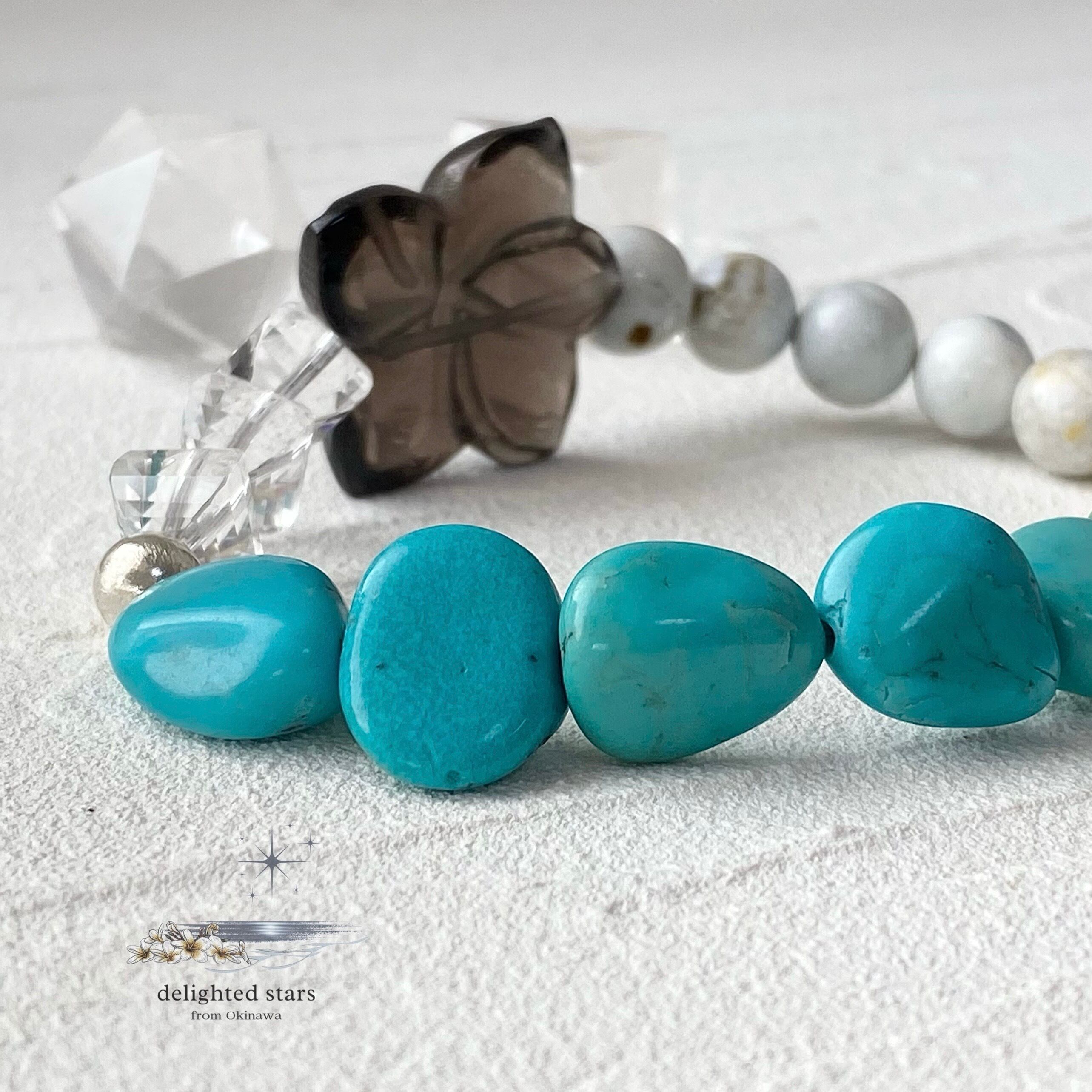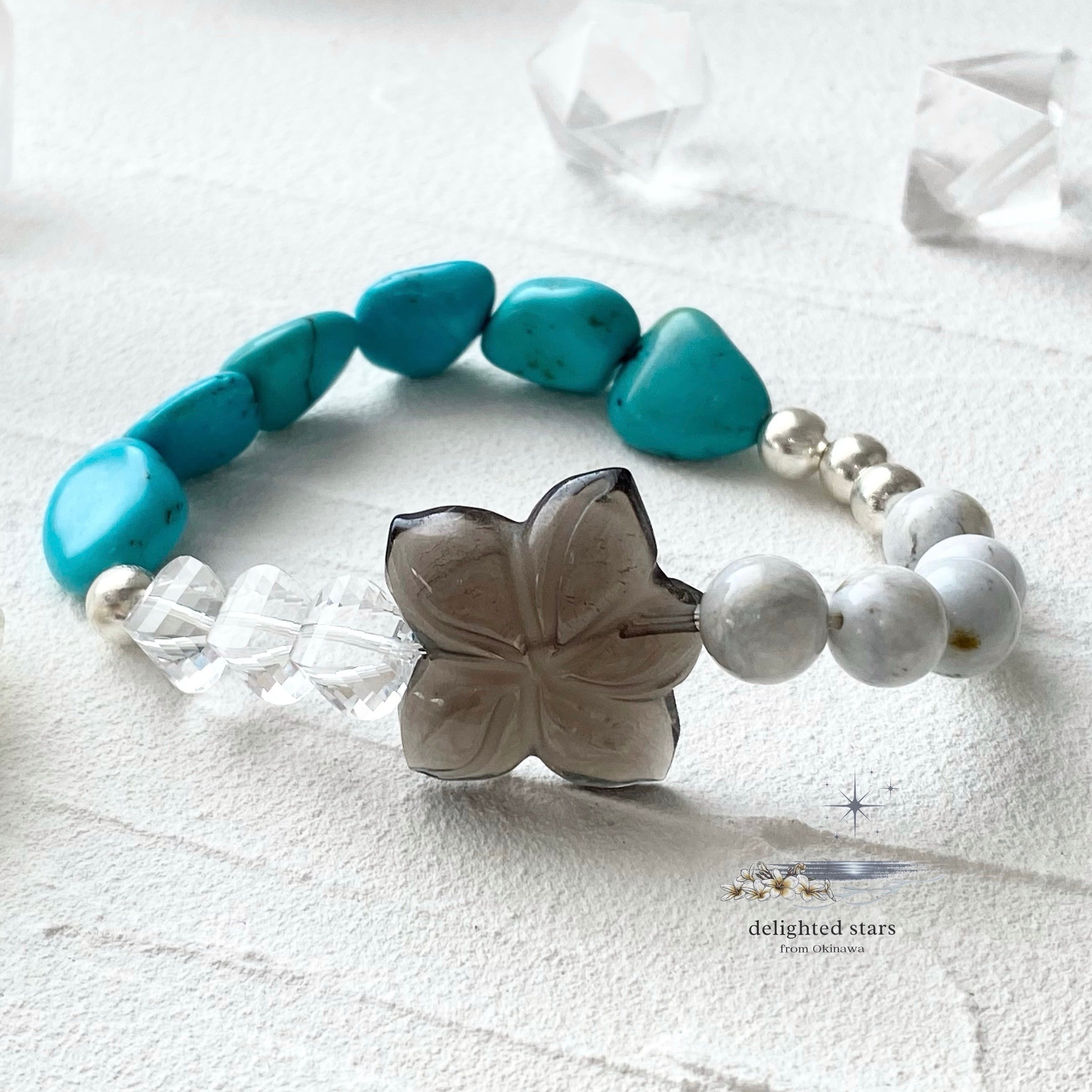 ターコイズ スモーキークォーツ プルメリアの彫り 大理石オパール 水晶 カレンシルバー 天然石ブレスレット パワーストーンブレスレット